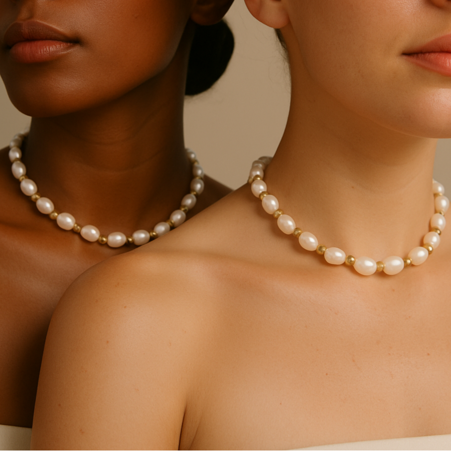 To maintain the beauty of your pearls and crystals, please avoid wearing your necklace in water. Salt water and chlorine can weaken their natural properties and may cause discolouration of the beads.